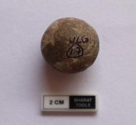 | Description / विवरण | Sling ball of spherical shape. Some portion is damaged. It is dull red in colour |