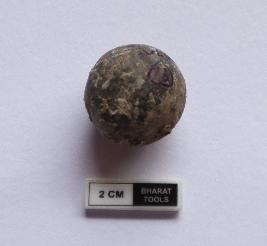 | Description / विवरण | Sling ball of spherical shape. It is black in colour. Some portion is partially damaged |