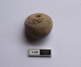 | Description / विवरण | Arecanut shaped bead. It is dull red in colour. Half portion is missing |