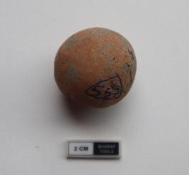 | Description / विवरण | Sling ball spherical in shape. Some portion is damaged. It is dull red in colour |
