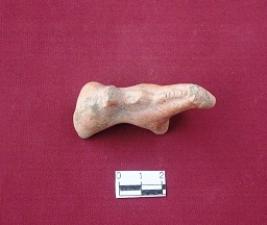 A horse of red fabric with preserved muzzle depicls on applque eye on its rights side, however, it is missing on the other side, nostrils shown by depression and mouth by on incision on the neck region the manes are prominently indicated by on indentation.On to back saddle can be seen.Out of four limbs,one hindlimb is broken.No toil.Mould techniqes.