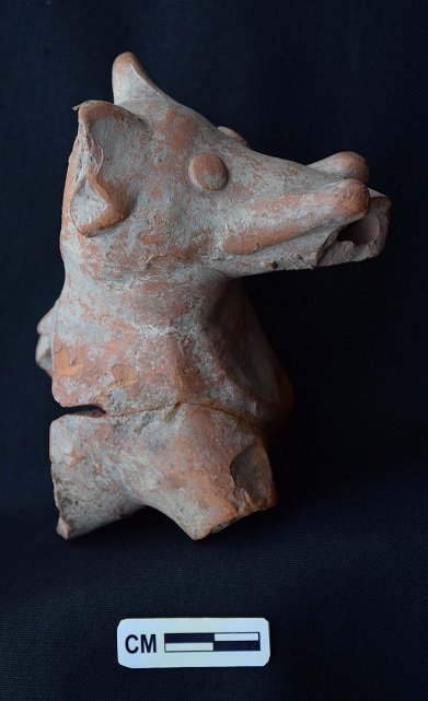 A humped bull figurine red fabric has well preseved nuzzle depicting on enboss decorated Ferehead on applique pierced hole on its right side, a chain on the neck and mouth by on incision.Forelimts are intect, howeres,hindlimbs one broken.No tecil.Hnad modelled.