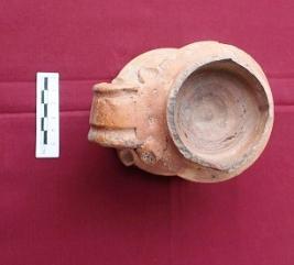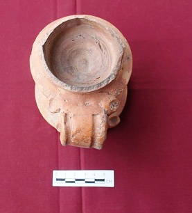 An earthen-lamp of red fabric with hollow pedestal base and a strap like handle is used in to ceremeny perfermed in the warship of god by moving it circulationg round the idol.It is decurepted with emboss spirals found around it and on the front and rear ends od pwswarL, which is having a ribbed disc.Spirals grooves one found on the base.The handle with two elorgeled groove is luted to the lamp.However,the top edge of the lamp throughout is broken.wheel turned techniqie and luting technique have been used.