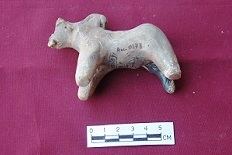 A humped bull figurine of pale red fabric has broken muzzle depicting on enboss decorated forehead and on applique eyes.Out of four limes three aon intact and one hind limb is broken.No tail.Hand modelled