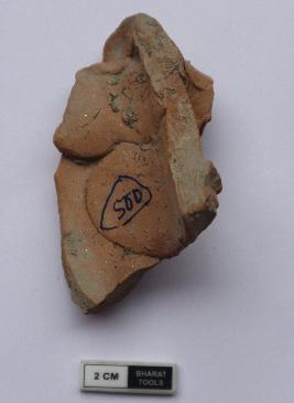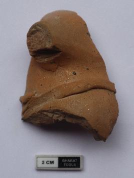| Description / विवरण | Fragment of animal figurine having mutilated face and applique design on neck. It is red in colour |