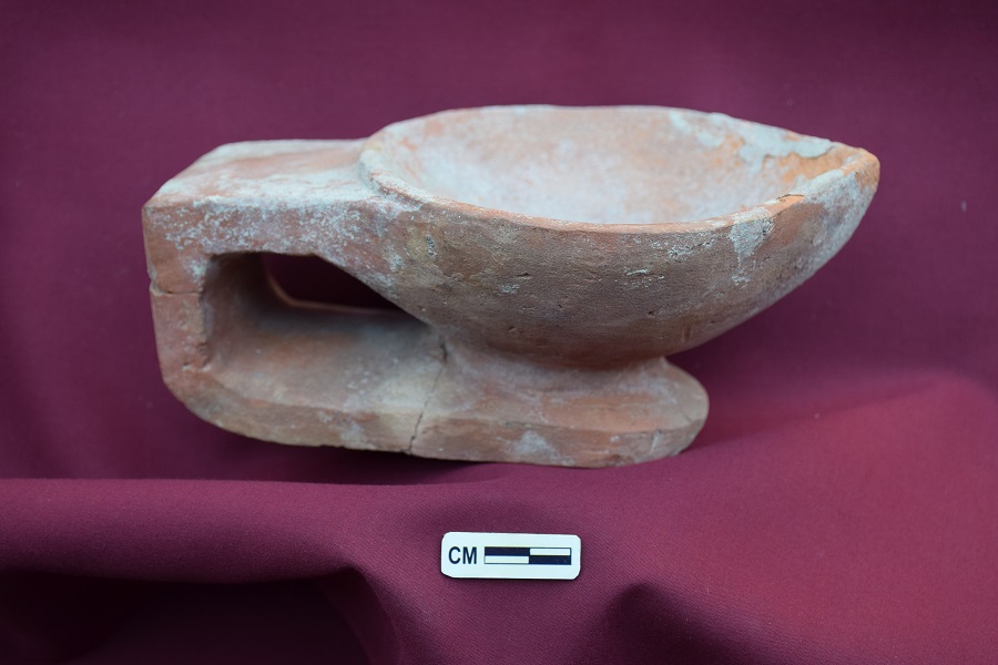 An earthen-lamp of red fabric relatively large and heavy one with narrow end for lick somewhat round deep covity for oil.It has arul base cuntnuing with strep like handle and it is used in the ceremany perfermed in the warshiop of god by moving it circulatay round the idol.Whel turned.