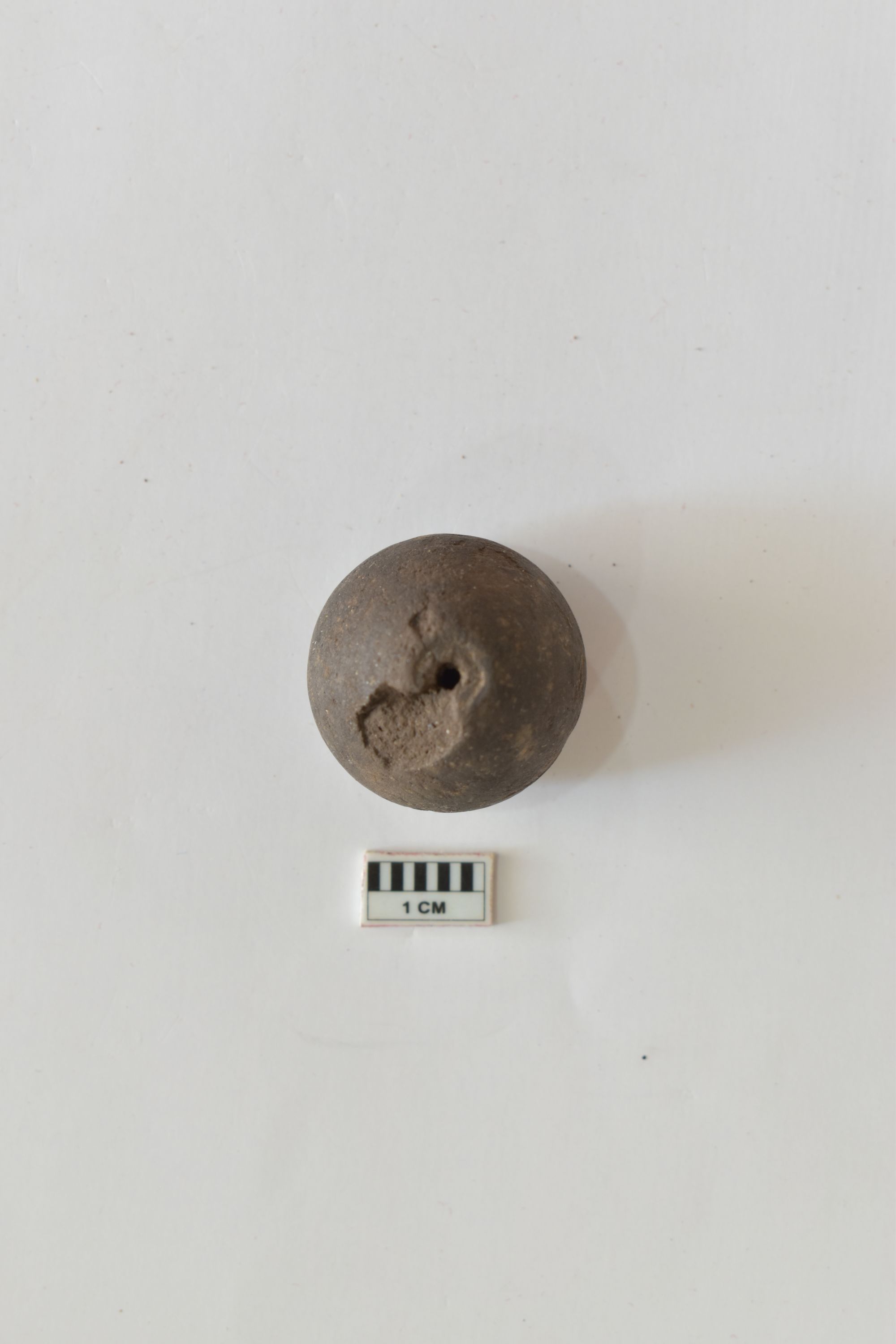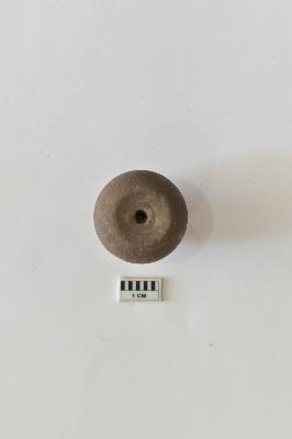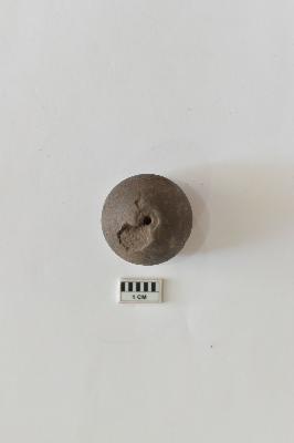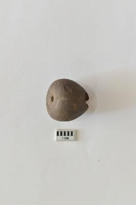 It is a ghat-shaped bead made of terracotta, of blackish color and rough surface. It has a hole passing through it, for attaching more beads to it. It was used for ornamental purposes.
