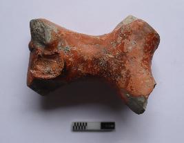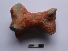| Description / विवरण | Animal figurine having a mutilated face, all limbs are missing. It is red in colour and has a dark red slip on it |