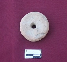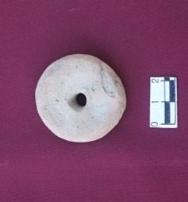 A plano-convex wheel of dull red fabric with a perferation almost in the centre.Wheel turned technique used.