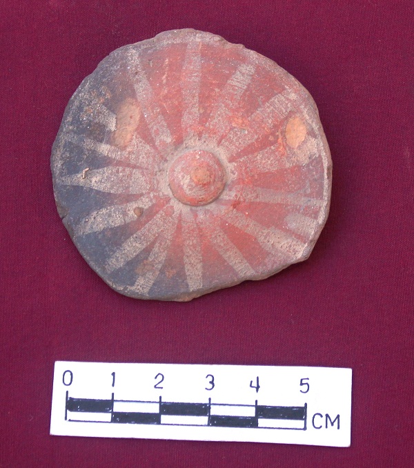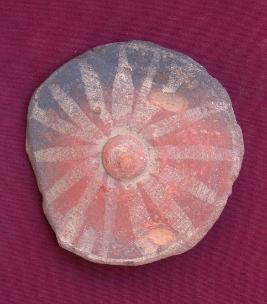 A disc of red fabric depicts floral decoration. The petals have been shown by painted in golden color attached to an embedded round central paut of the flower. Black mark due to ill-firing.Scar marks can be seen on the surface. Broken out to edge.the wheel turned technique has been used.It is a disc, not a wheel, as mentioned in the accession register.