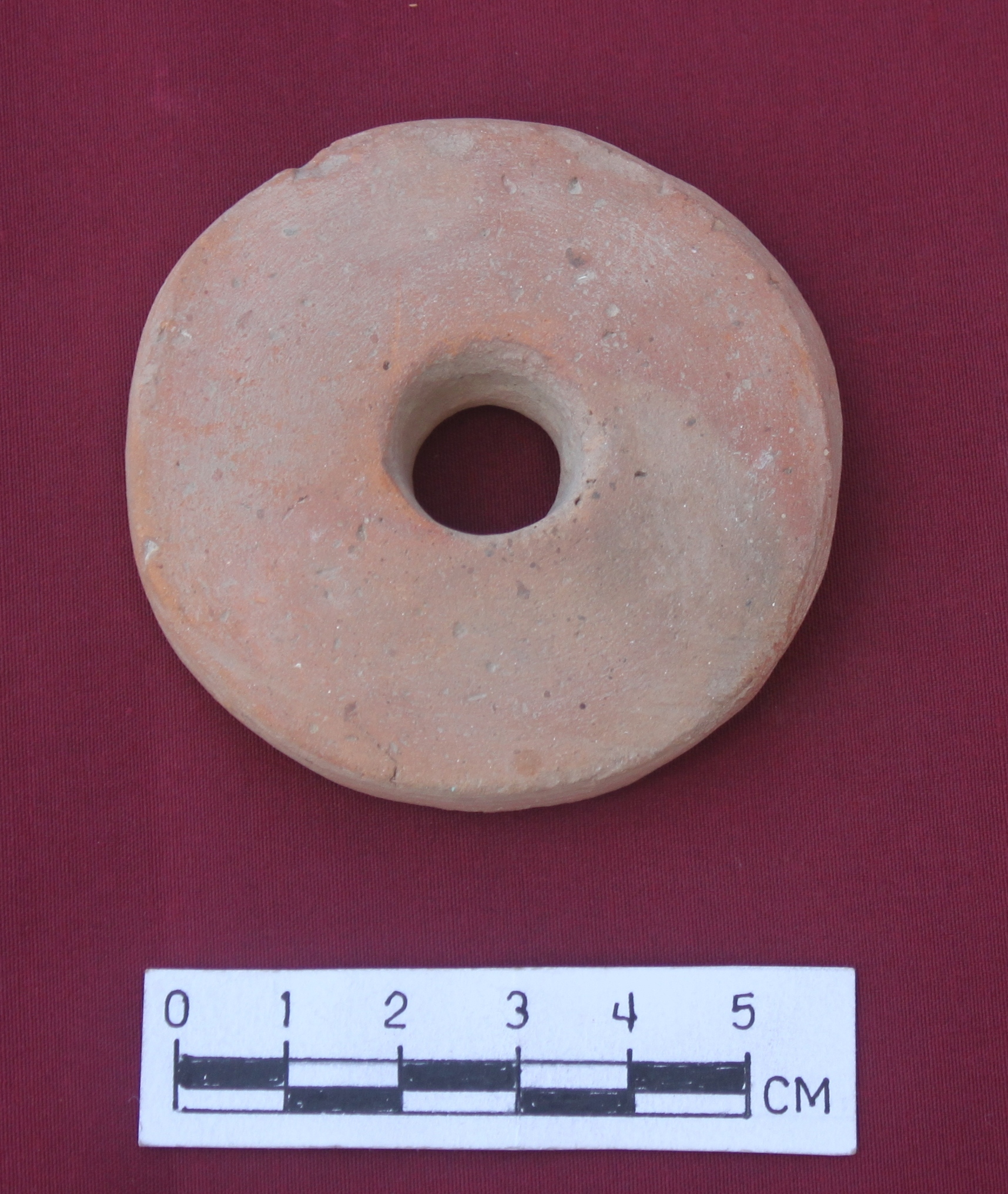 A plano-convex wheel of red fabric with a perforation almost in the centre. The wheel turned technique used.