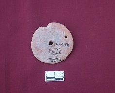 A disc of red with perforations lies in the same axs, the centre one is bigger than to side one. Wheel-turned technique used. It is a disc, not a wheel, as mentioned in the accession register.