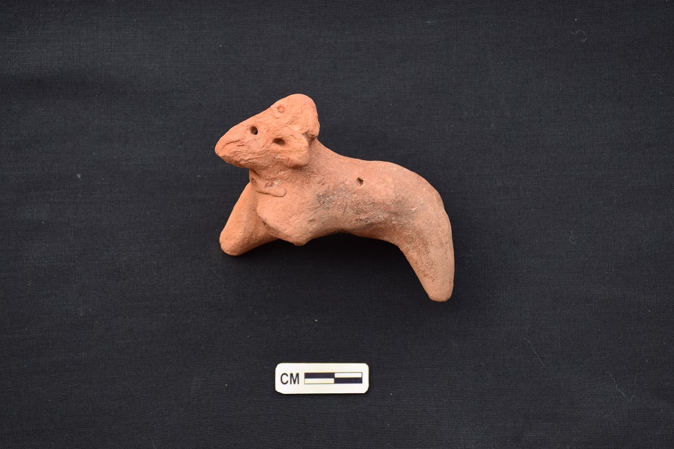 A bull figurine of red fabric depicts forehead and eyes formed by pierce holes,ears by an incision, the muzzle is broken a chain on the neck,left forelimb and right limb ore broken,rest two limbs ore intact.Hand modelled.