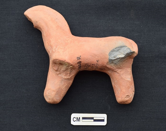 A headless camel of red fabric with neck.Right forelimband hindlimb ore intect,while,left forelimb and hindlimb are broken.Hand modelled.