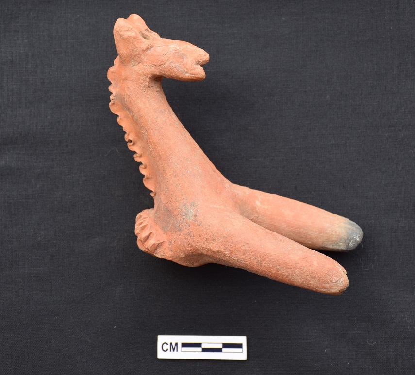 A fragmented horse of red fabric depicts conical ears its well preserved muzzle shous eyes formet by tiny holes and mouth by a deep incision.Mans have been indicated indentations on the neck.Forelimbs and partly portion of decurahed saddle can be seen.however rear portion is completely broken.Hand modelled.