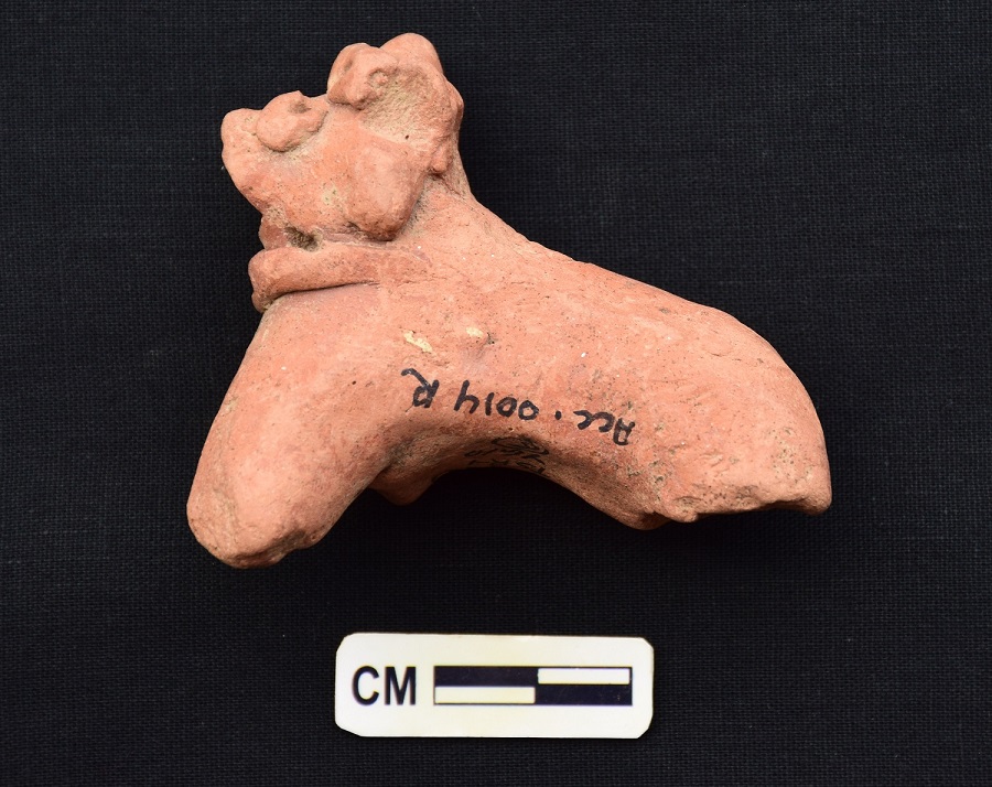 A bull figurine of red fabric depicts a grooved line on the head,decurated forehead,eyes ore formed by pierced circlets,mouth is brioken.A decurative band on the neck in applique,left forelimb is intact,while,right one is broken,bath hindlimb ore broken.Hand modelled.