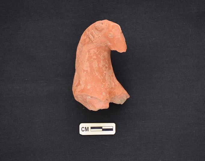 A bird figurine of red fabric with a broken beak,eyes have been formed by pierced circlets, nostril by piercing,damaged bands with pin-holes on the neck. The rest portion is broken.Hand modelled.