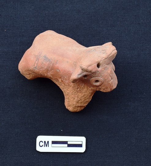 A quadruped figurine of red fabric depicts forehead and eas formed by pierced holes,muzzle is broken,eyes ore formed by pierce circlets and all the four limbs ore broken.Hand modelled.