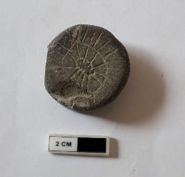 | Description / विवरण | Terracotta disc like object with graffiti marks on one side. The graffiti is in the form of radiating lines from the centre and two parallel circles through the radiating lines. |