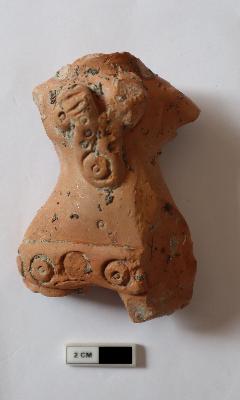 | Description / विवरण | Terracotta human figurine (woman). It is red in color and adorned with heavy ornaments having stamped decorations. Head and arms are missing |