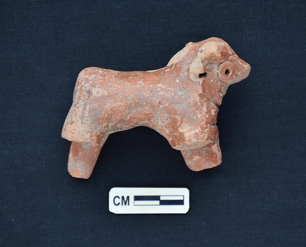 A broken humped bull figurine of red fabric depicts broken ears formed by on incision,eyes ore formed by dierced circlets muzzle is broken and below it,two grooved lines can be seen.Limbs ore broken.Hand modelled.