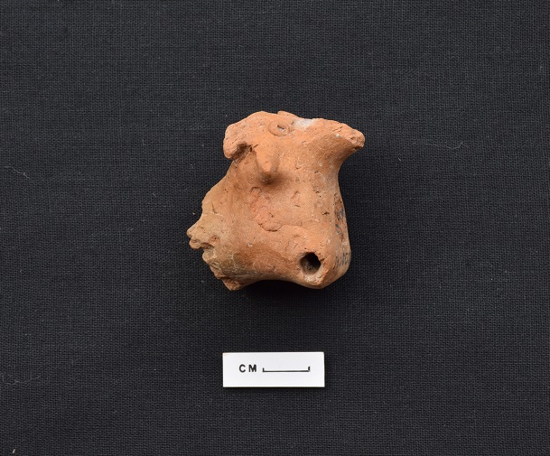 A fragmented animal figurine of dull red fabric depicts conical ear left ear broken,circlets eyes in applique,Muzzle is chipped off.Hind-portion coumpletely broken.Transverse holes in the frount indicate that it has intended to be used as wheeled toy.Hand modelled.