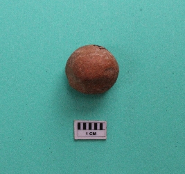 | Description / विवरण | A terracotta sling ball in spherical shape. It is red in color and partially damaged in condition. |