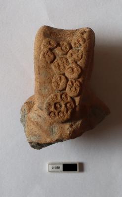 | Description / विवरण | Fragmentary part of a terracotta figurine. The extant part shows applique discs with floral motif stamped on it. |