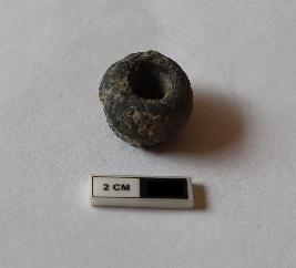 | Description / विवरण | Ghat shape bead. It is black in color and partially damaged |