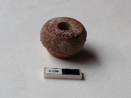 | Description / विवरण | Ghat shape bead. It is red in color and partially damaged |