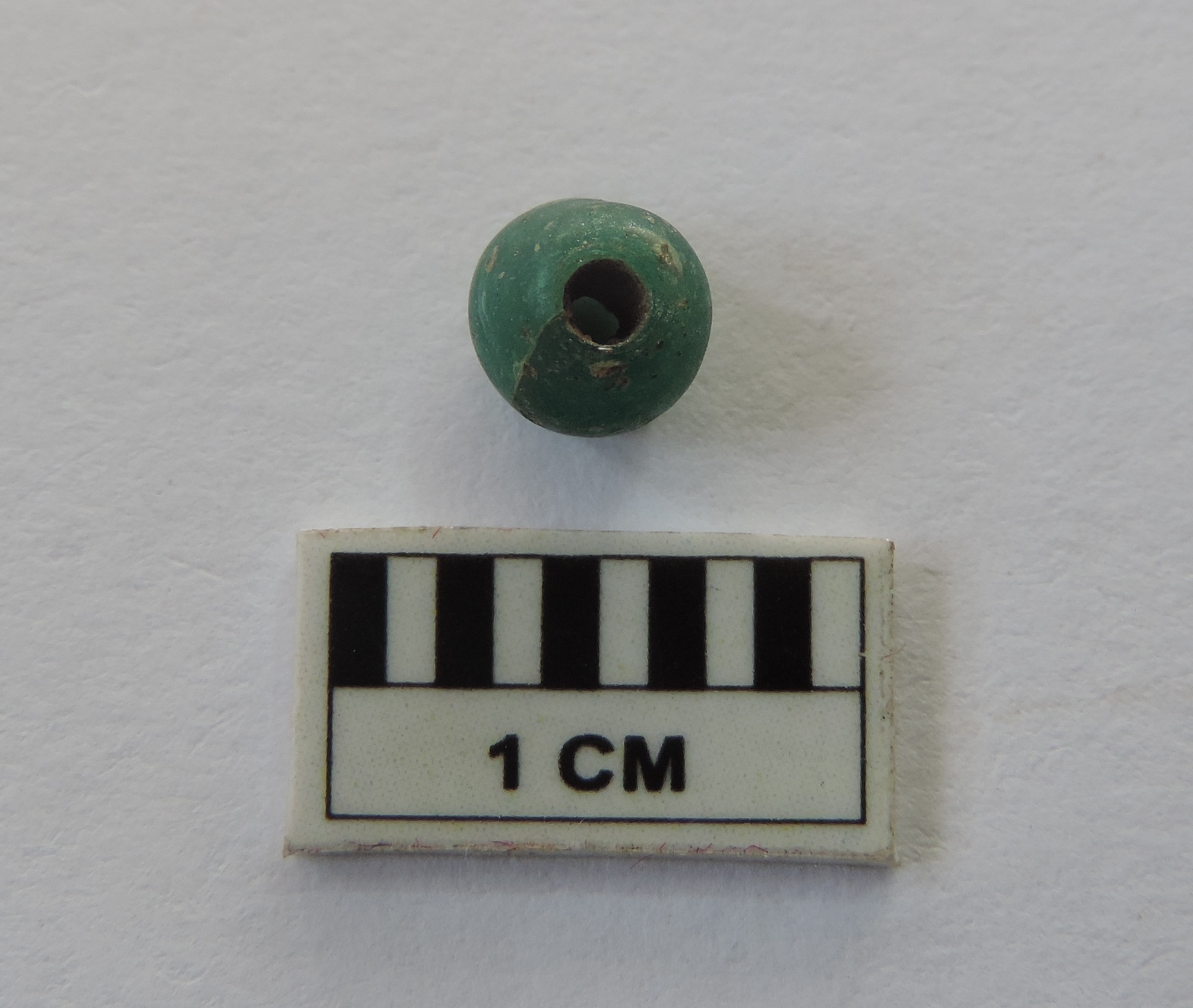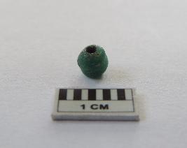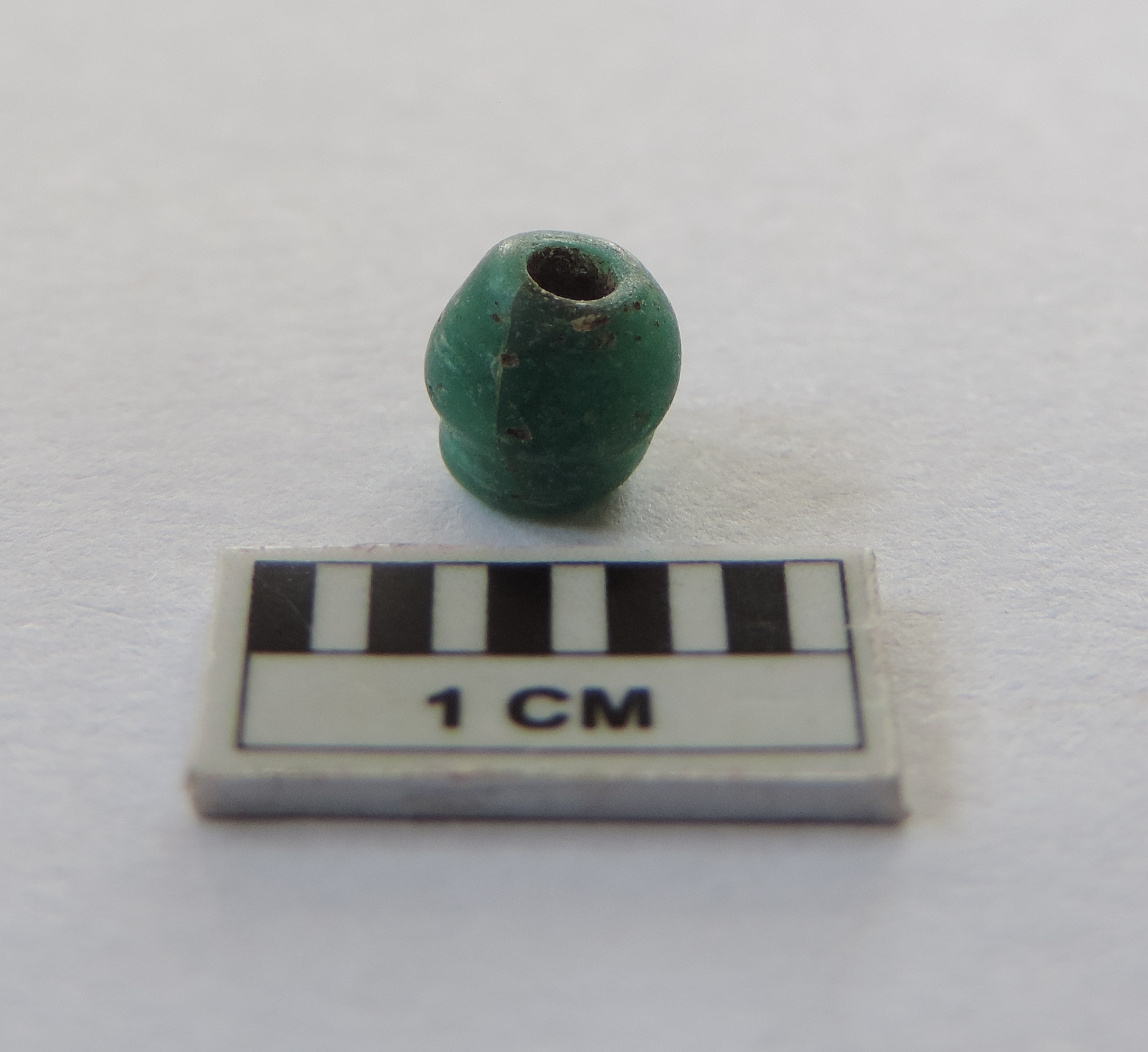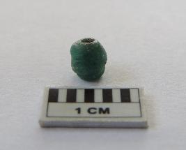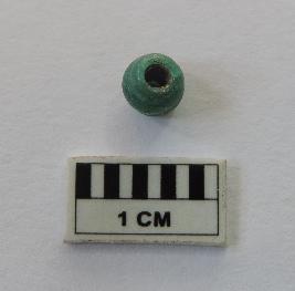 A truncated circular green bread with perforations on both ends, passing through it.