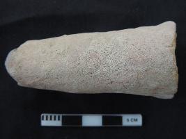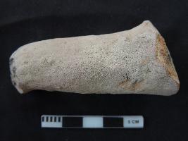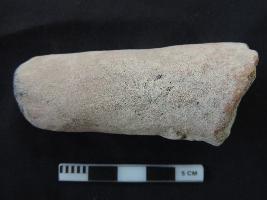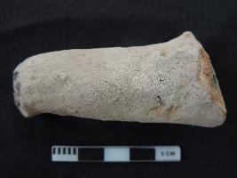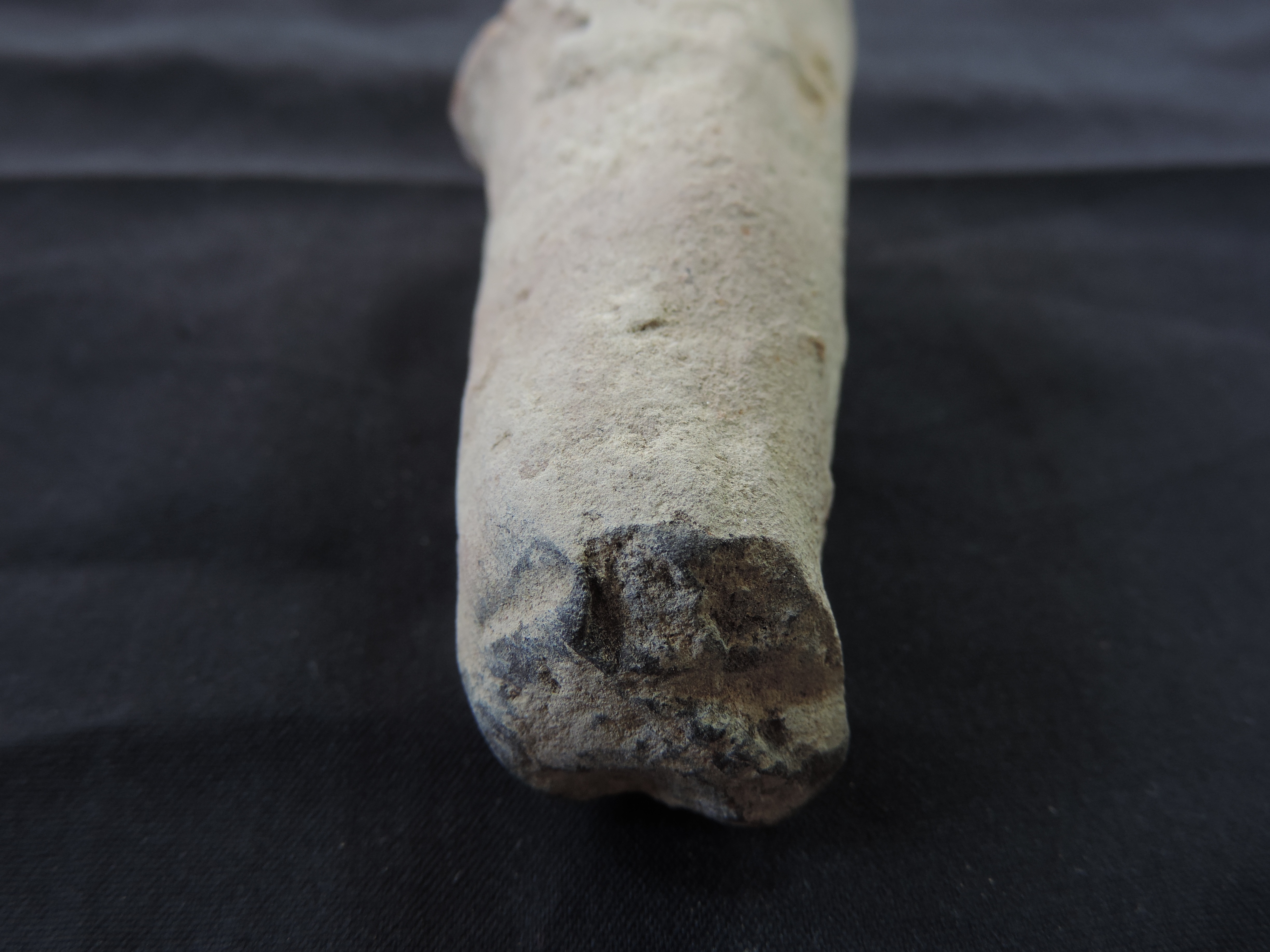 It looks like a broken piece of a leg of an animal ( ). It is bleck around the edges on one end and ill-baked in the centre, visible on the other end.