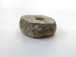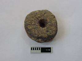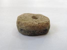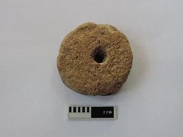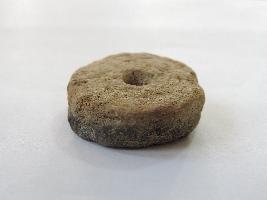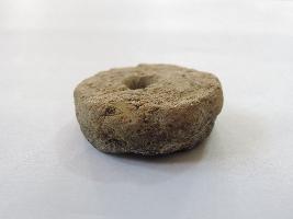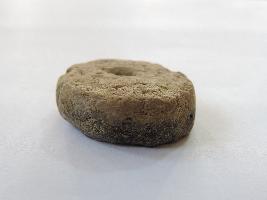 A terracotta wheel with perforation on both ends passes through it. The wheel has soot marks on one face, because of which it appears dark in colour.