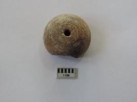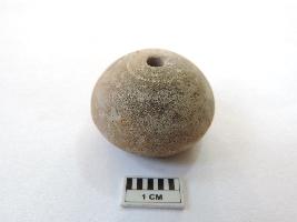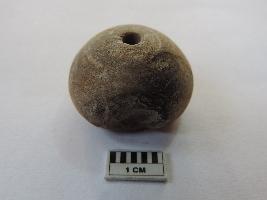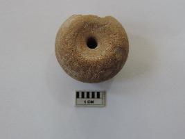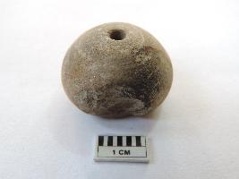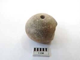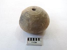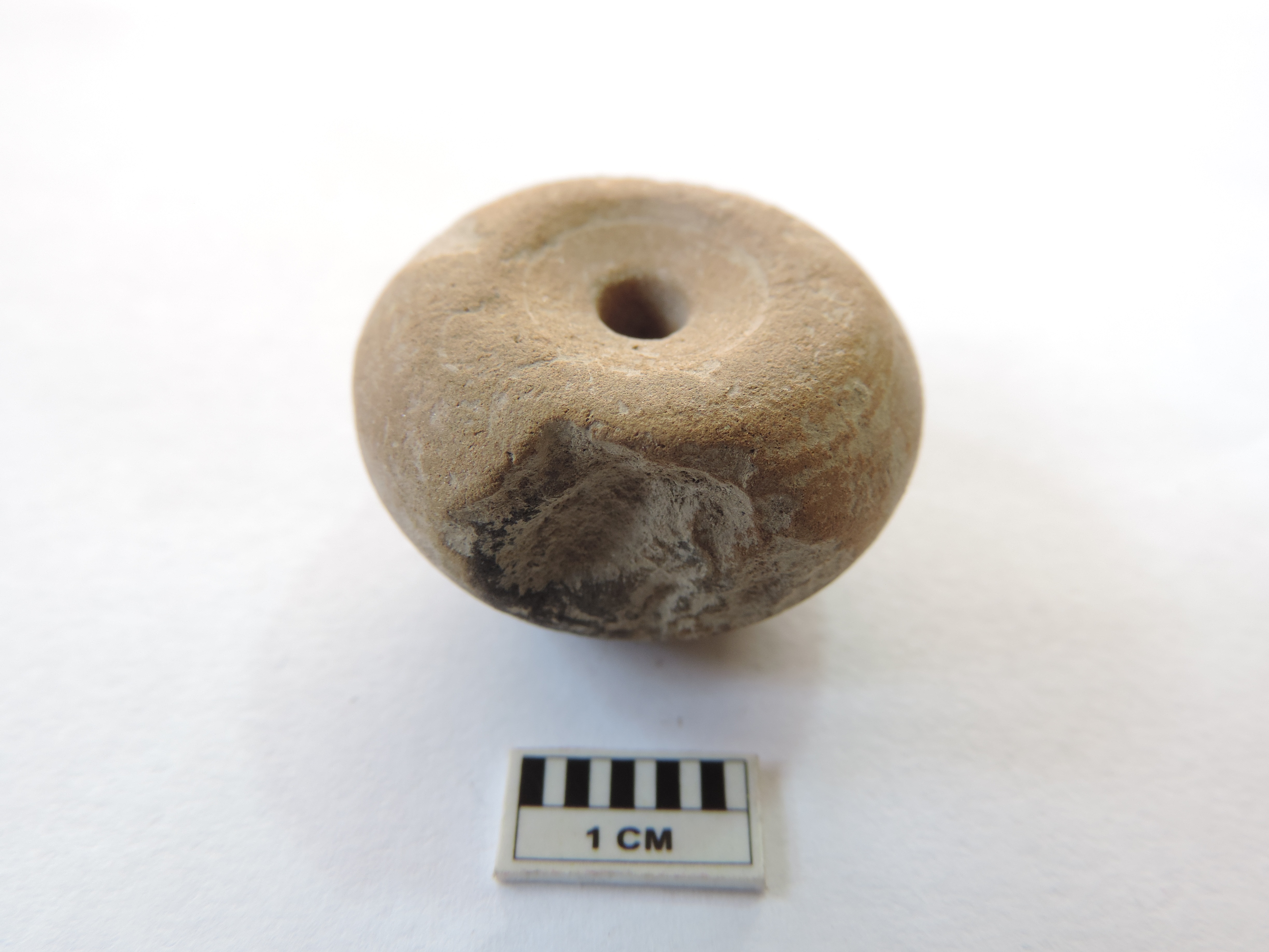 An areca nut-shaped bead with a truncated edge and perforation on both ends passing through it. On the side, the bead is partially broken.