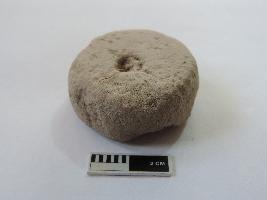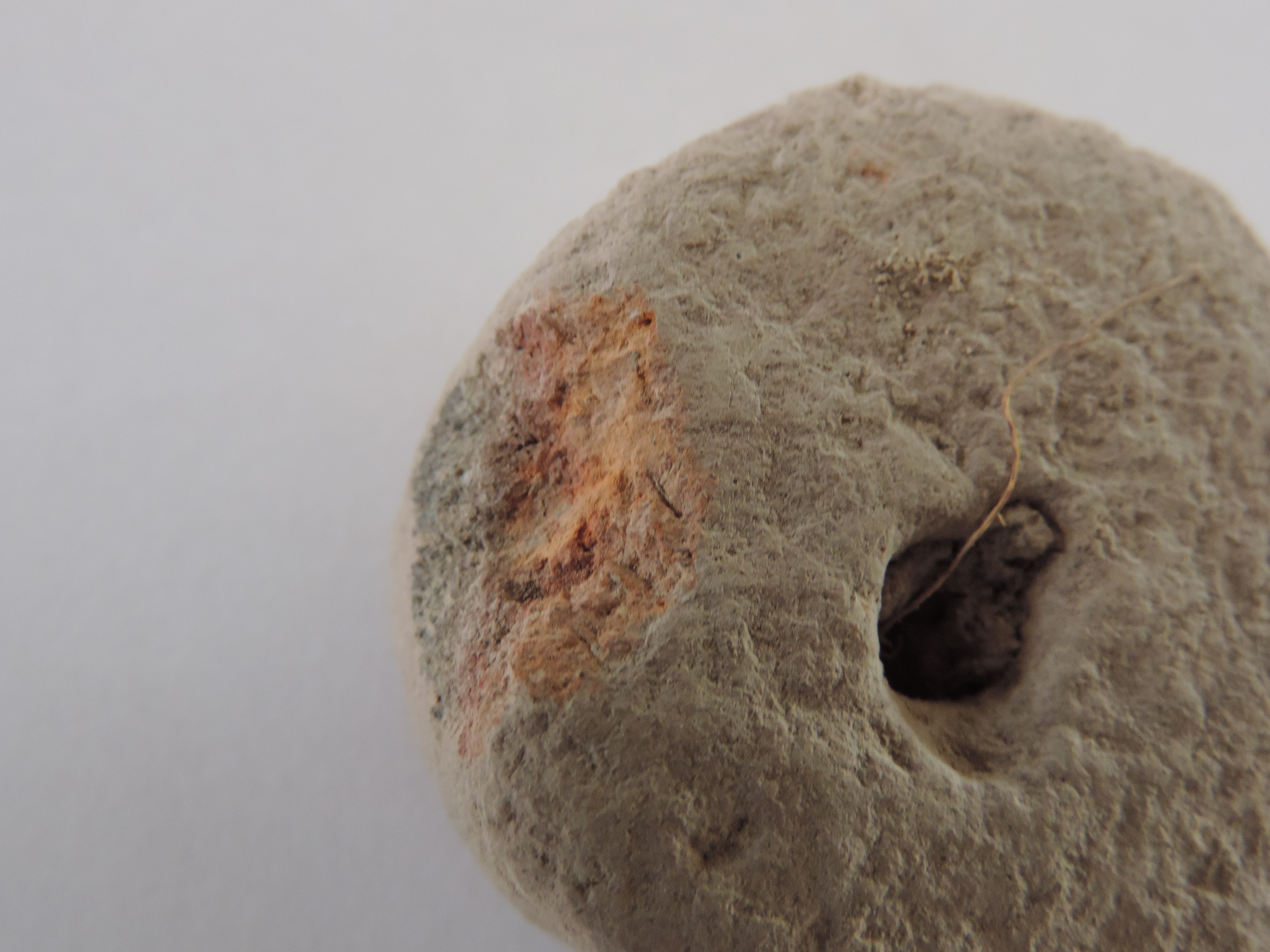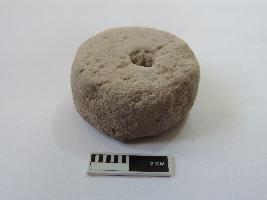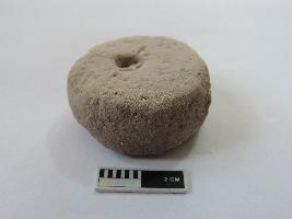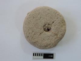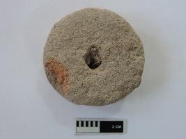 A partially damaged wheel with perforation on both ends passing through it. The perforation is not at the centre but a little to one side. In the damaged part, slight visibility of ill-baked condition is visible due to the black colour.