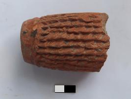| Description / विवरण | Skin rubber is cylindrical in shape. It has deeply grooved longitudinal lines. Half portion is missing and it is red in color |