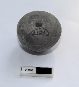 | Description / विवरण | Arecanut shape bead. It is black in colour and partially damaged |