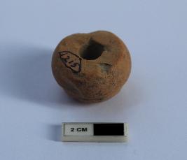 | Description / विवरण | Ghat shape bead. It is red in color and partially damaged |