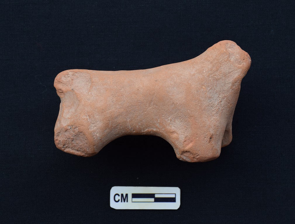 A defaced quadruped of red fabric with short tail and broken limbs.Hand modelled.