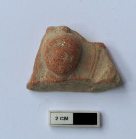 | Description / विवरण | A broken part of the terracotta plaque, only human face (Buddha) is discernible. Similar plaques, with varying degree of breakage, have been found in large numbers from the excavation. It usually depicts the standing figure of the Buddha with a kneeling devotee to his left and an attendant holding a long staffed parasol to the right of the Buddha. |