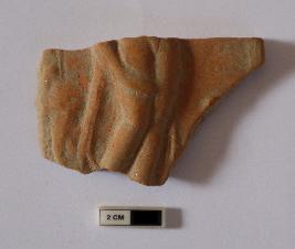 | Description / विवरण | The extant piece of the plaque depicts the standing Buddha figure below the waist, the feet are also missing. Similar plaques, in varying degrees of breakage, have been found in large numbers during excavation at the site. It usually depicts the standing Buddha as a central figure, flanked by a kneeling devotee to his left and an attendant holding a long staffed parasol to his right. |