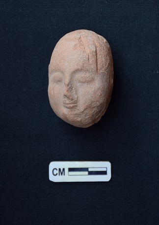 A male head withat ears,ridge damaged nose,eyes and mouth are formed by incision.Hand modelled.
