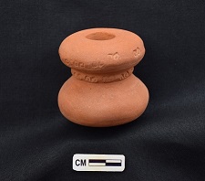 A broken circular dabber of dull red fabric is a potter s artifact with a constriction in the middle demarcating the broad center. The constriction and round cavity give a better grip to hold it with the left hand from inside the pot when tapping it from outside by the right hand with a wooden pat to give shape at hand green stage during the preparation of the pot. The middle and knob surface is decorated with incised geometrical decorations. Wheel turned.