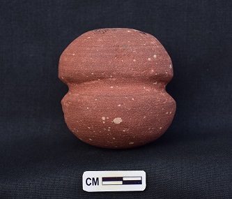 A circular dabber of red sandstone with a constriction in the middle demarcating base and knob which ore of almost equal in dimension meant for giving shape during the preparation of the pot. Hand modeled.