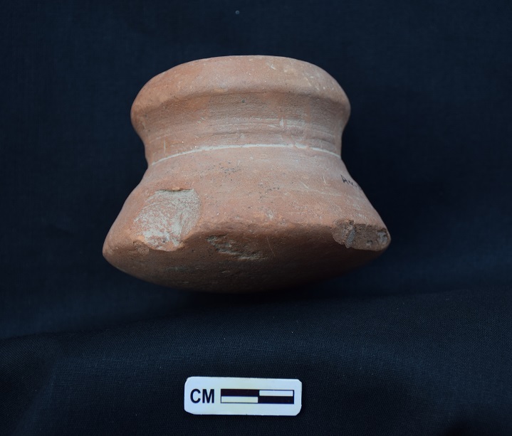 A circular dabber of dull red fabric is a potter s artifact with a constriction decorated with a band in the middle demarcating a broad round base and knob, the later one having a round cavity in its center. The constriction and cavity gives a better grip to hold it with the left hand from inside the pot when tapping it from outside by the right hand with a wooden pat to give shape at the hard green stage during the preparation of the pot. Wheel turned.