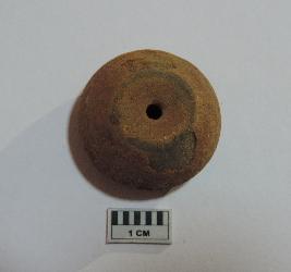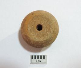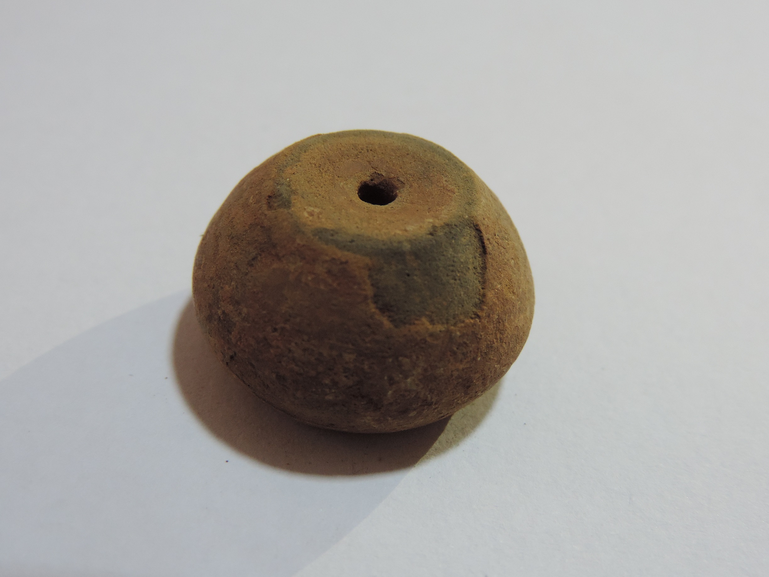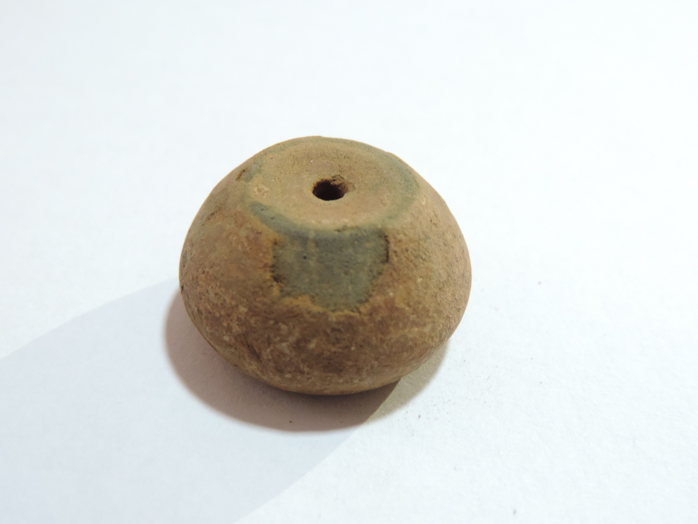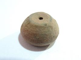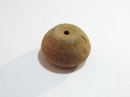 An areca nut-shaped bead, with perforations on both ends passing through it. The bead has some eroded areas, resulting in the removal of the upper layer in some parts.