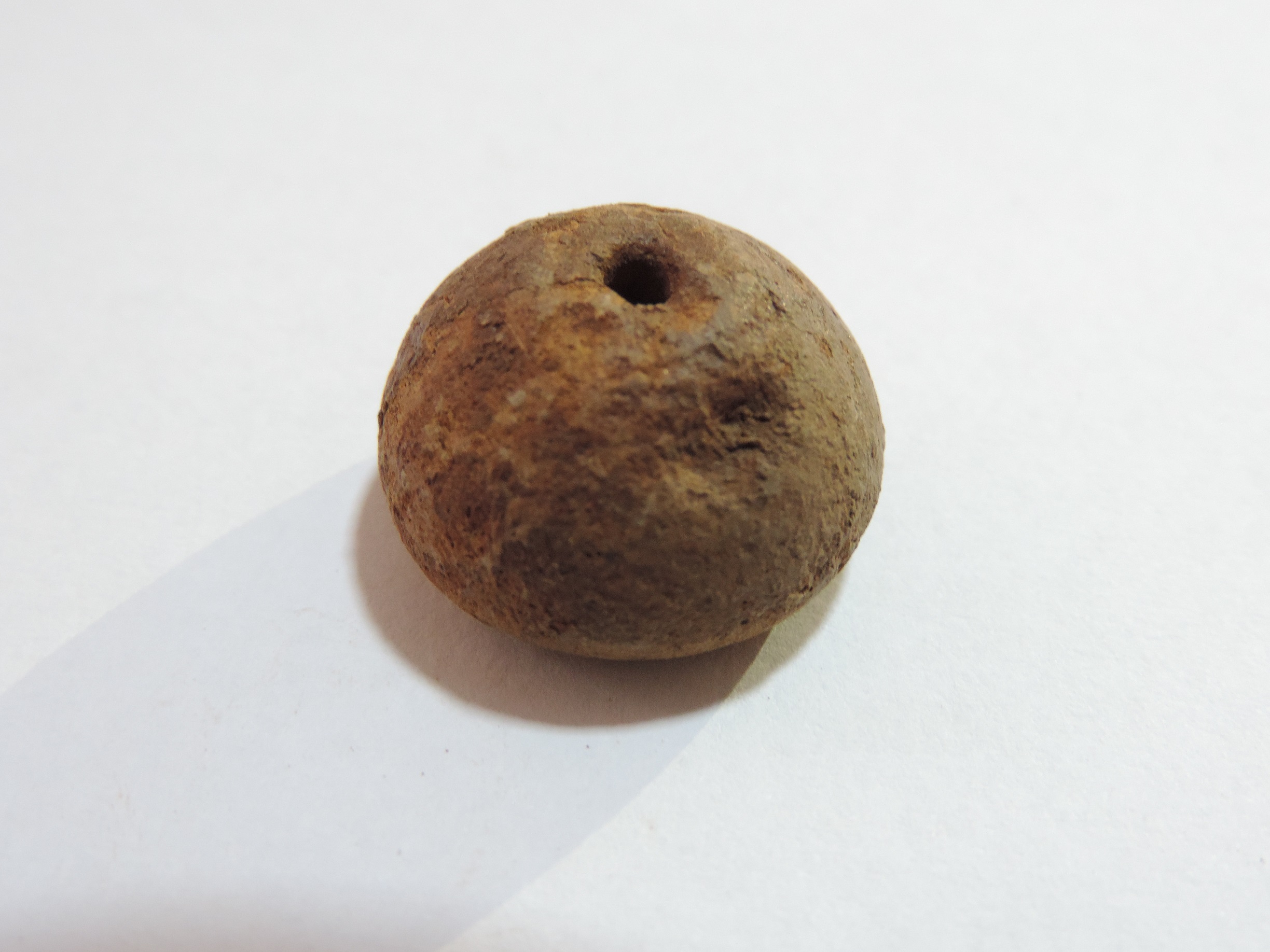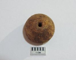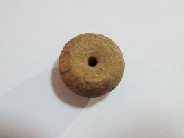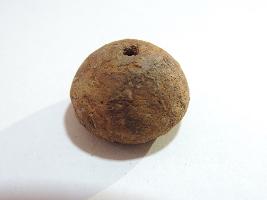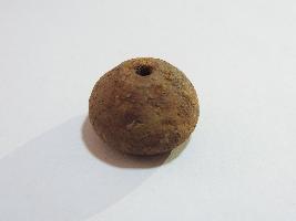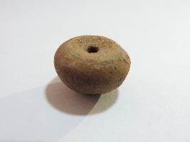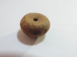 An areca nut shaped-bead with perforation on both sides passing through it. There is a small groove on the body of the bead and it is completely covered with soil.