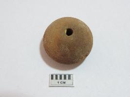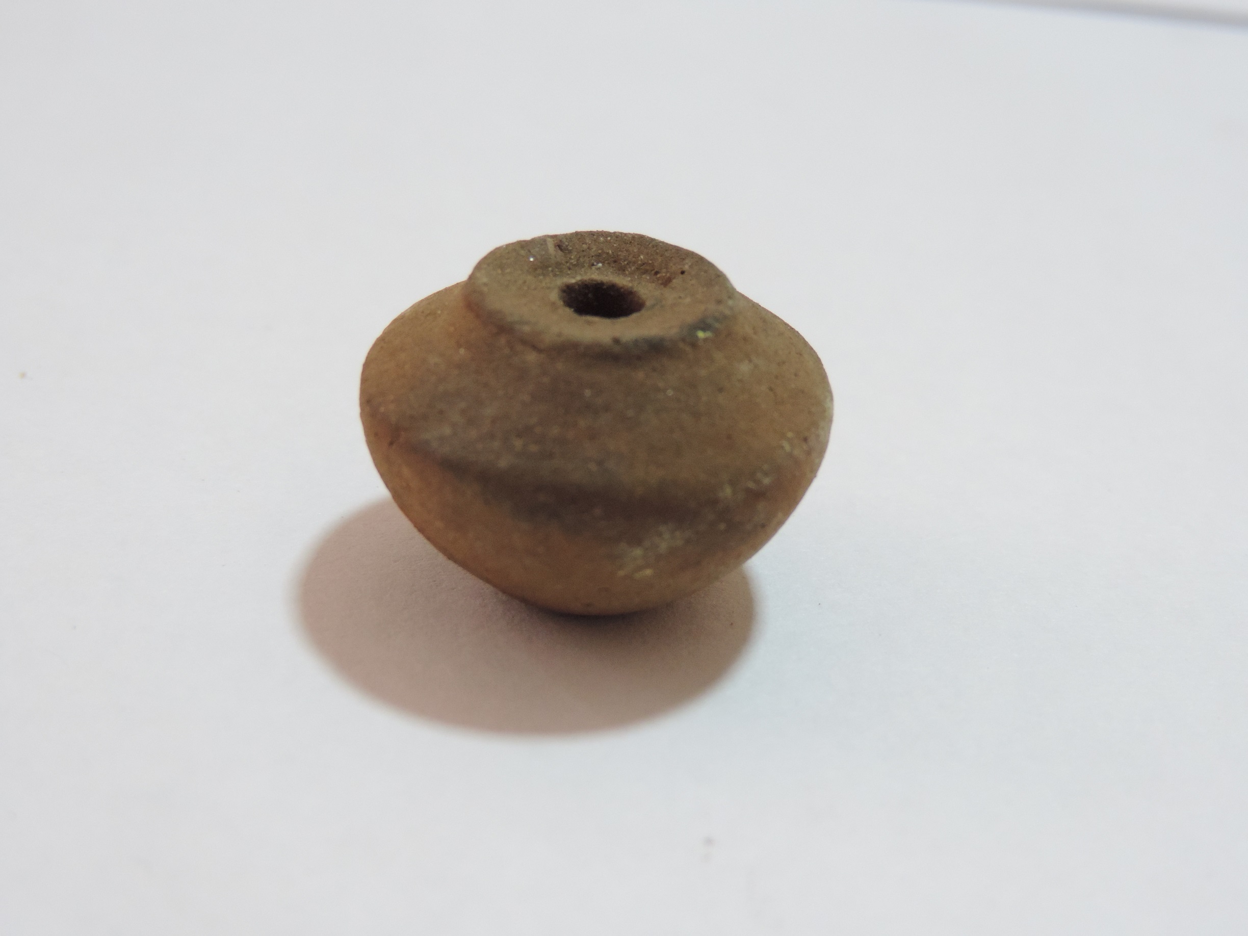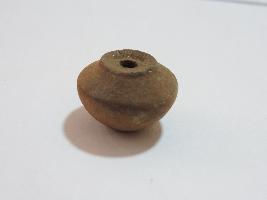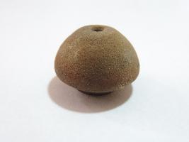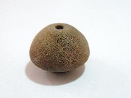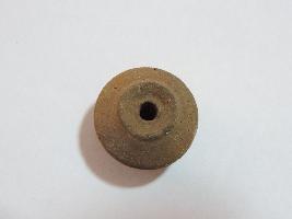 An areca nut shaped-bead with perforations on both ends passing through it. The bead has a raised base.