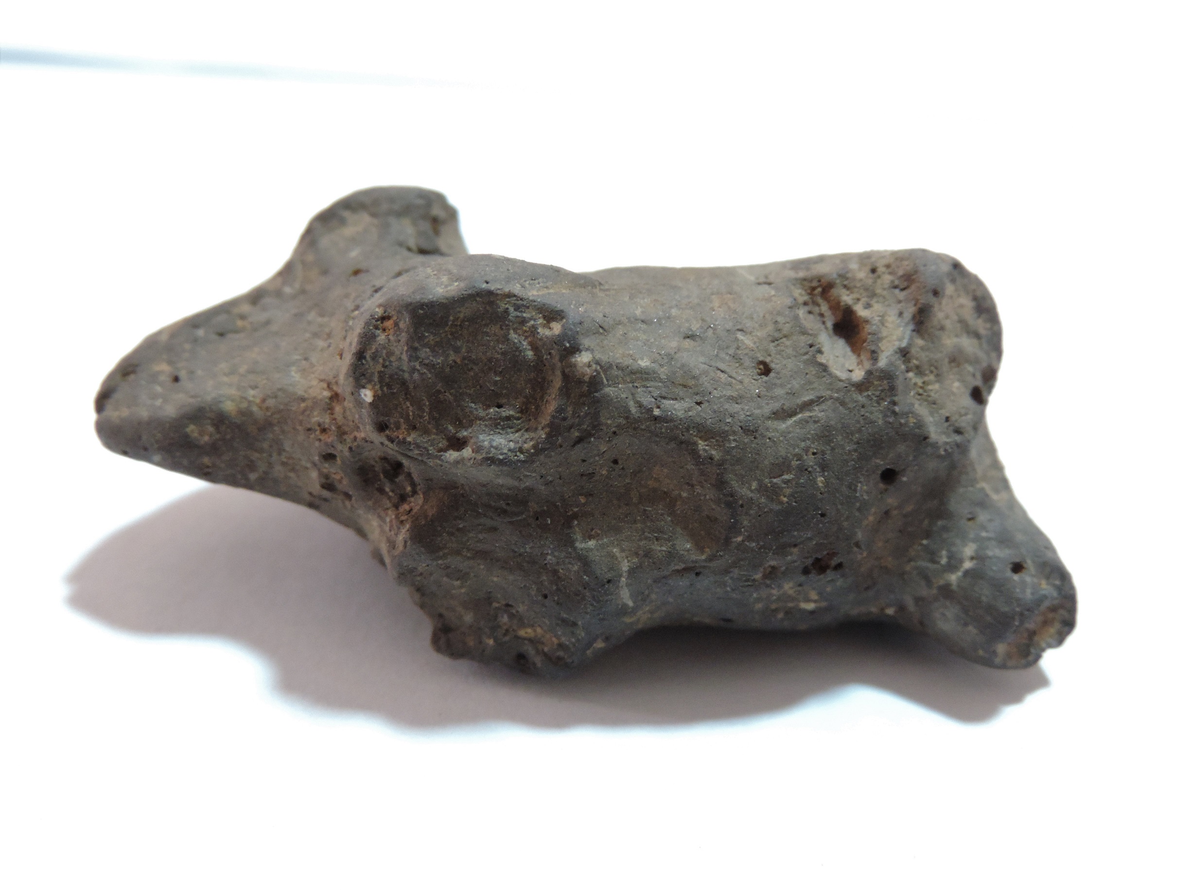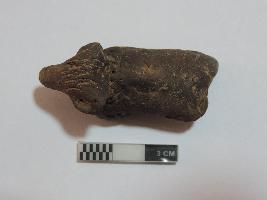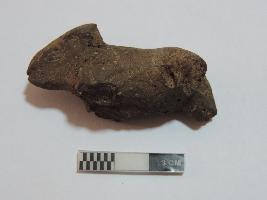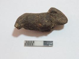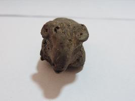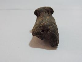 A small bull figurine whose limbs are broken. The face of the bull is visible. A designful collar is seen on the neck. At the back, the area of the tail is also broken.