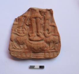 | Description / विवरण | Lower portion of a fragmentary terracotta plaque depicting image of the Buddha in standing posture and disciple is bow down on the left side of Buddha. |